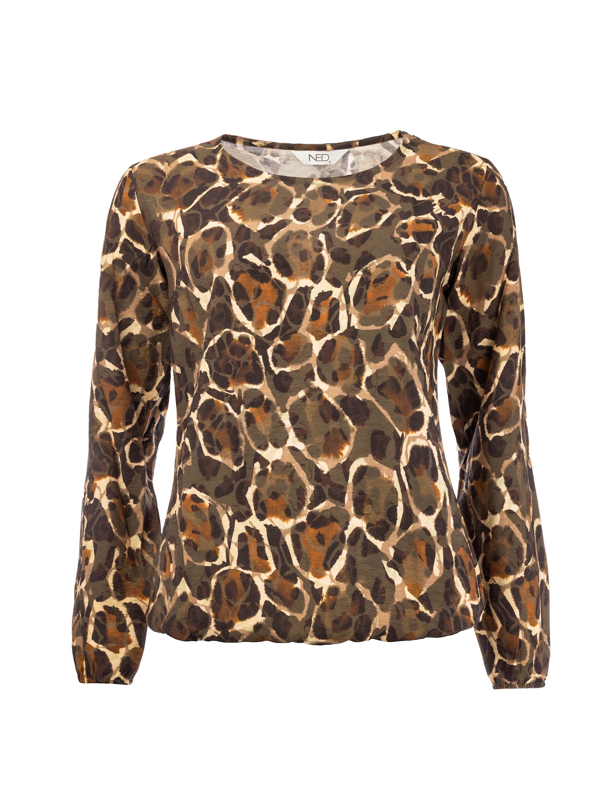Deze prachtige top met bruine animalprint is een echte eyecatcher voor het najaar. De top heeft lange mouwen met elastiek aan de manchetten en een ronde hals die is afgezet met een subtiele bies voor een verzorgde afwerking. De onderzijde met elastische boord zorgt voor een mooie, blousende pasvorm die comfortabel draagt en prachtig valt over een broek of rok.