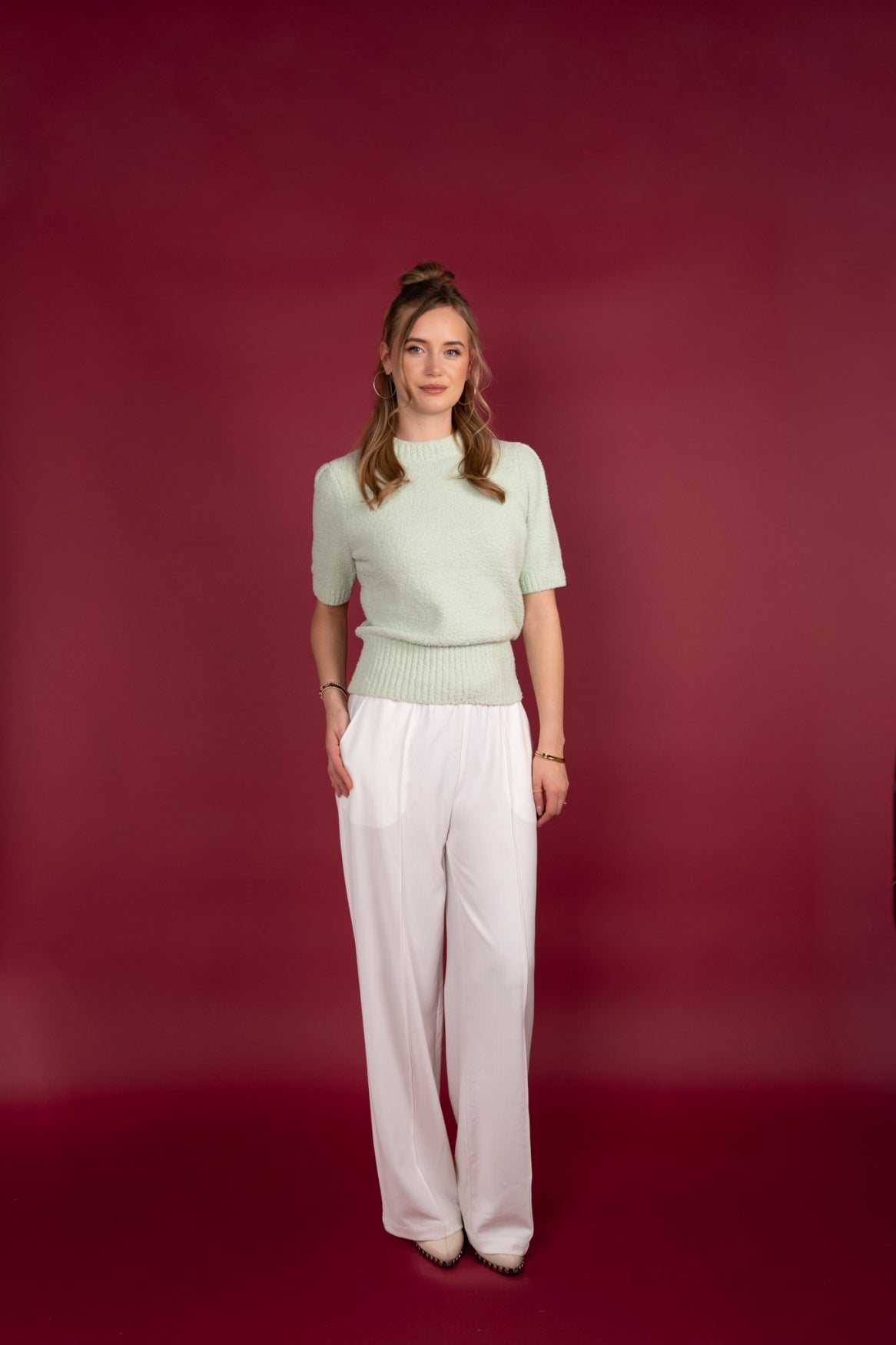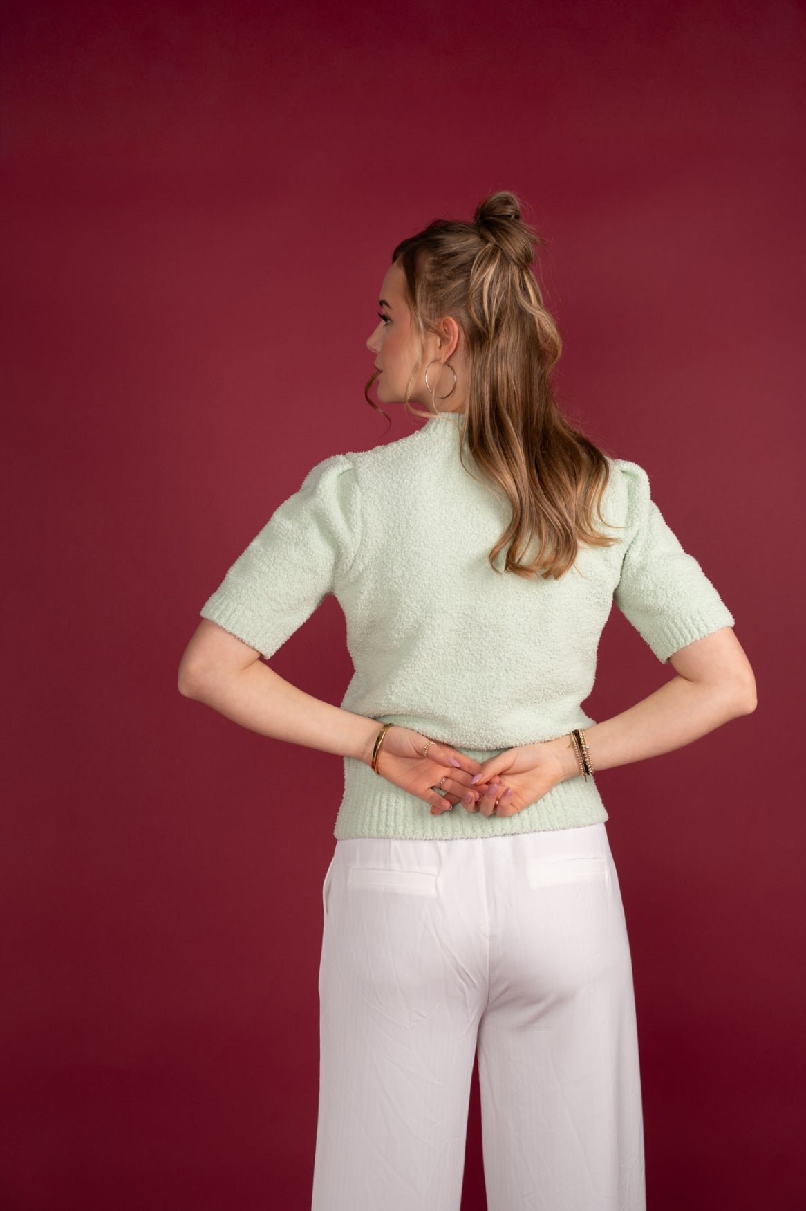 Deze gebreide top in zachte pasteltint is een elegante essential met een verfijnde en vrouwelijke uitstraling. De subtiele bouclé-achtige structuur geeft de top een luxe en moderne look, terwijl de zachte kleur zorgt voor een frisse, zachte basis die moeiteloos te combineren is. Perfect voor een stijlvolle voorjaars- of zomerlook.