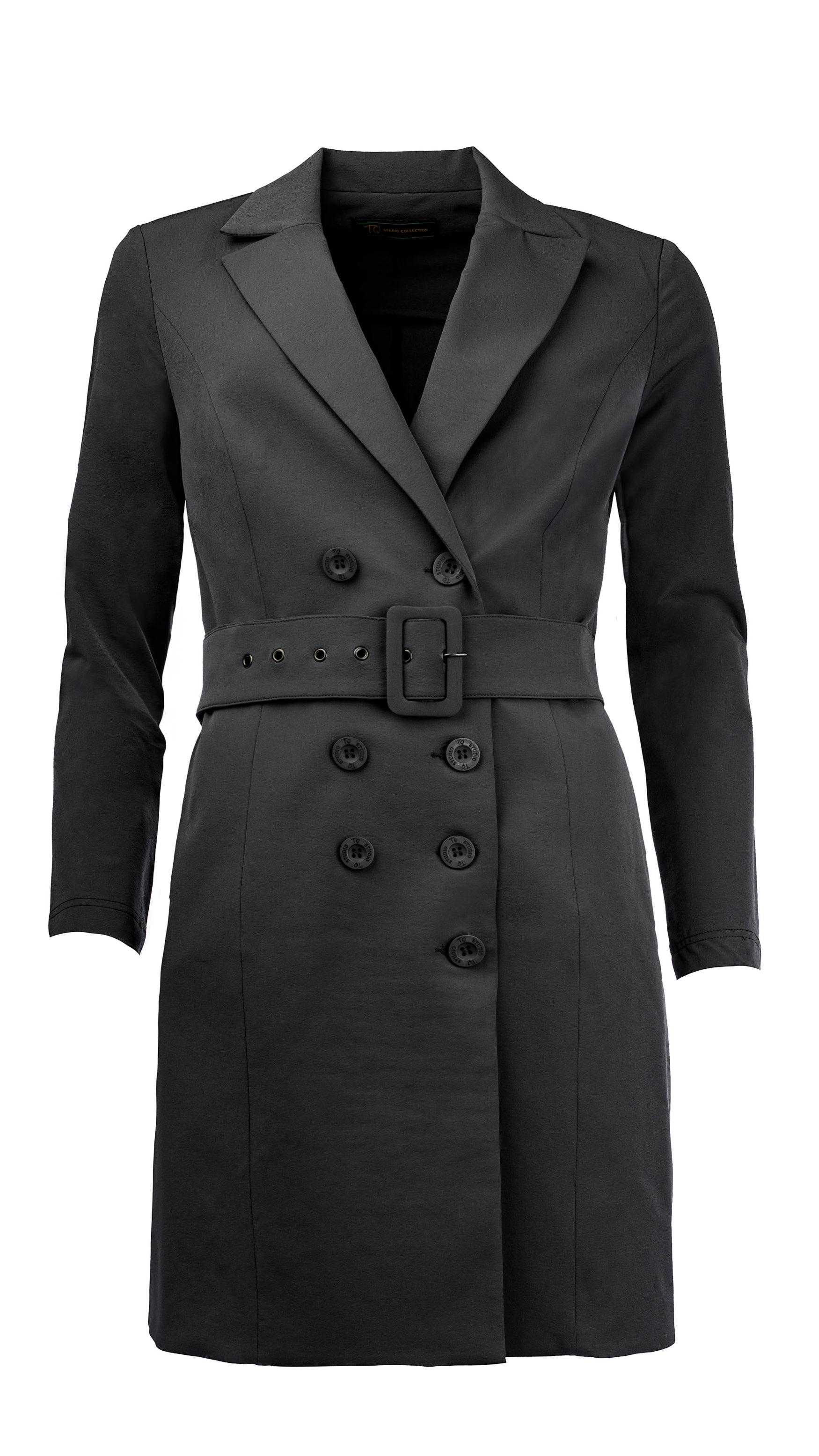 Deze Travelstof double breasted blazerjurk van de TQ Studio Collection, ook als jas te dragen, heeft een dubbele rij mooie grote knopen en een brede ceintuur.