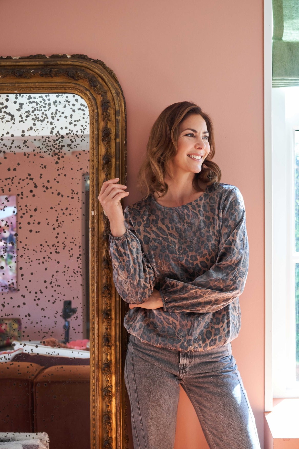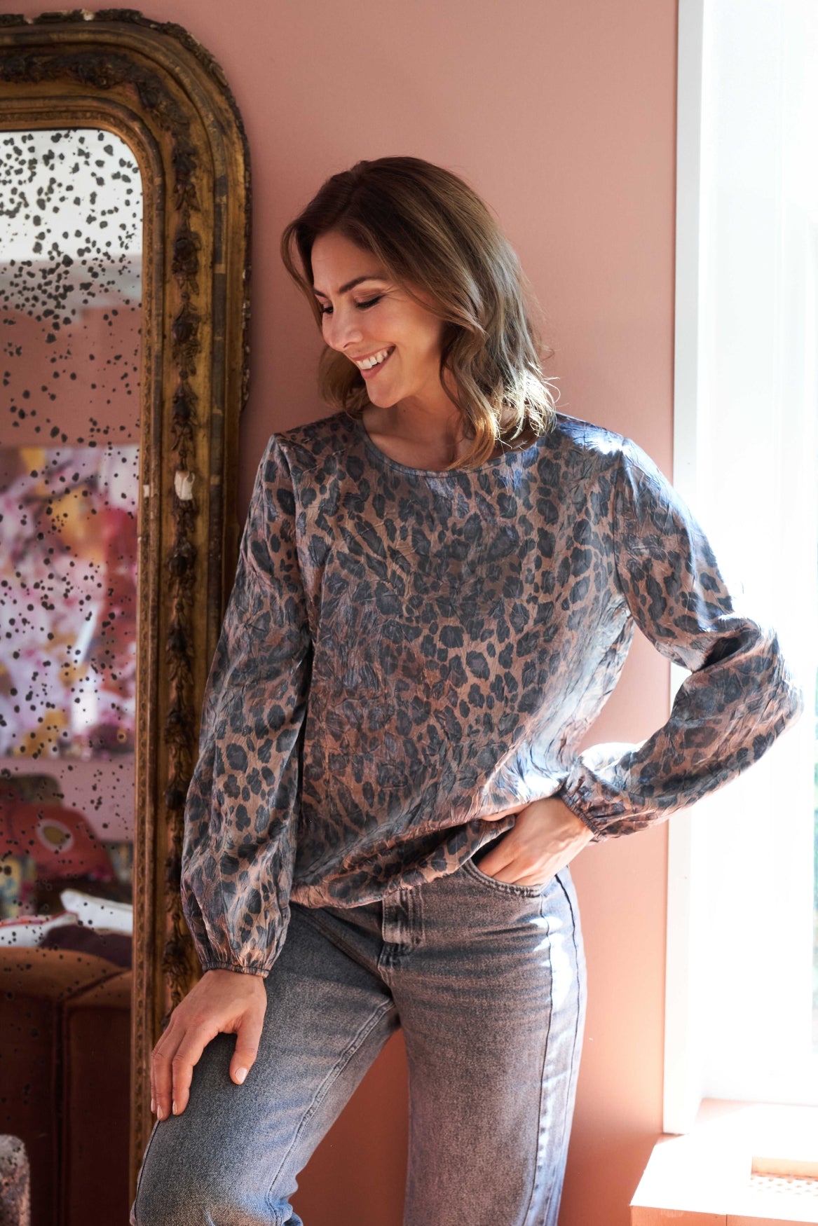 Deze chique dames top met glanzende panterprint in warme bruintinten is een echte eyecatcher! De ronde hals en lichte pofmouwen met elastische boorden zorgen voor een vrouwelijke uitstraling en optimaal draagcomfort. Dankzij de elastische boord aan de onderzijde valt de top mooi op de heup en creëert hij een elegante, blousende look.