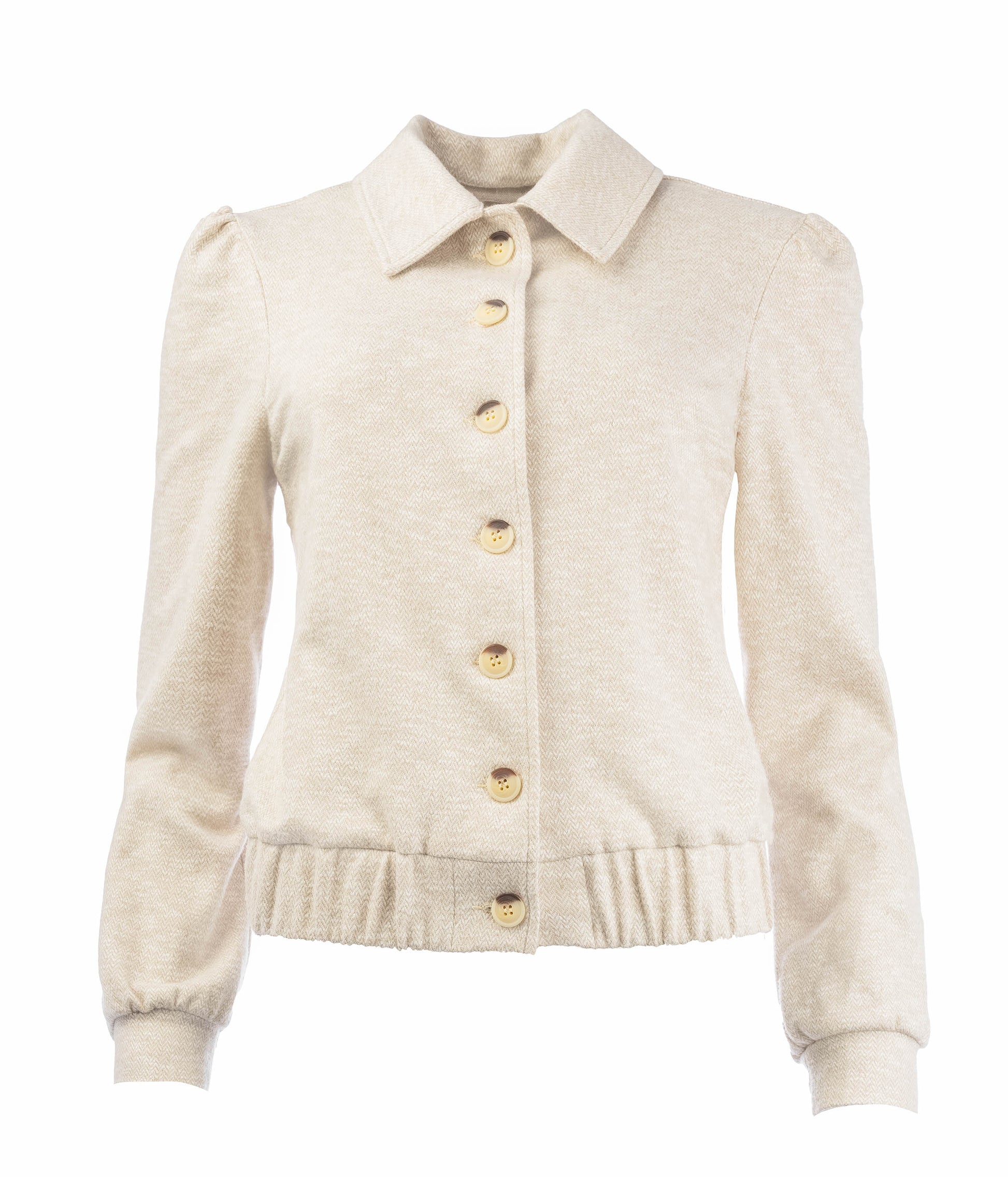 Dit stijlvolle jasje is de perfecte mix van klassiek en modern. De subtiele herringbone (visgraat) stof geeft een tijdloze, rijke uitstraling, terwijl de elastische tailleband zorgt voor een mooie, vrouwelijke pasvorm. De lichte pofmouwen voegen een speels accent toe en geven extra volume aan de schouders. Afgewerkt met een normale kraag en een knoopsluiting middenvoor is dit jasje zowel geschikt voor zakelijke als casual outfits.