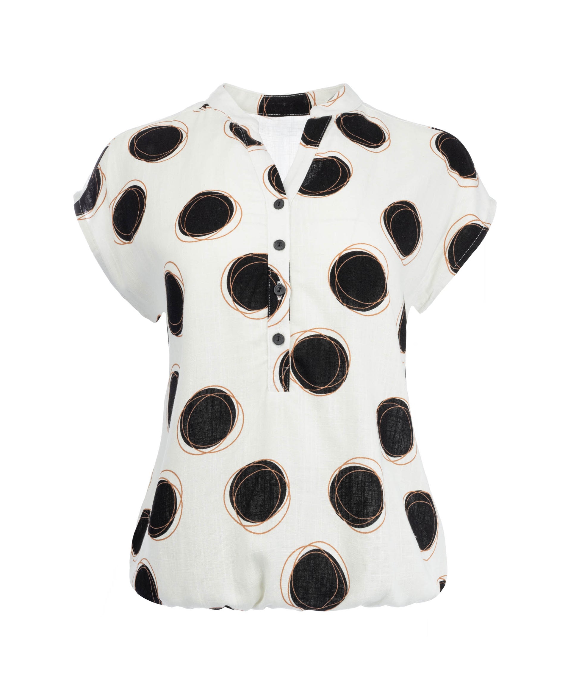Deze stijlvolle top in een frisse offwhite tint met opvallende zwarte cirkelprint straalt moderniteit en elegantie uit. Het grafische dessin geeft het ontwerp een speelse en eigentijdse uitstraling, terwijl de lichte basis zorgt voor een frisse, zomerse look.