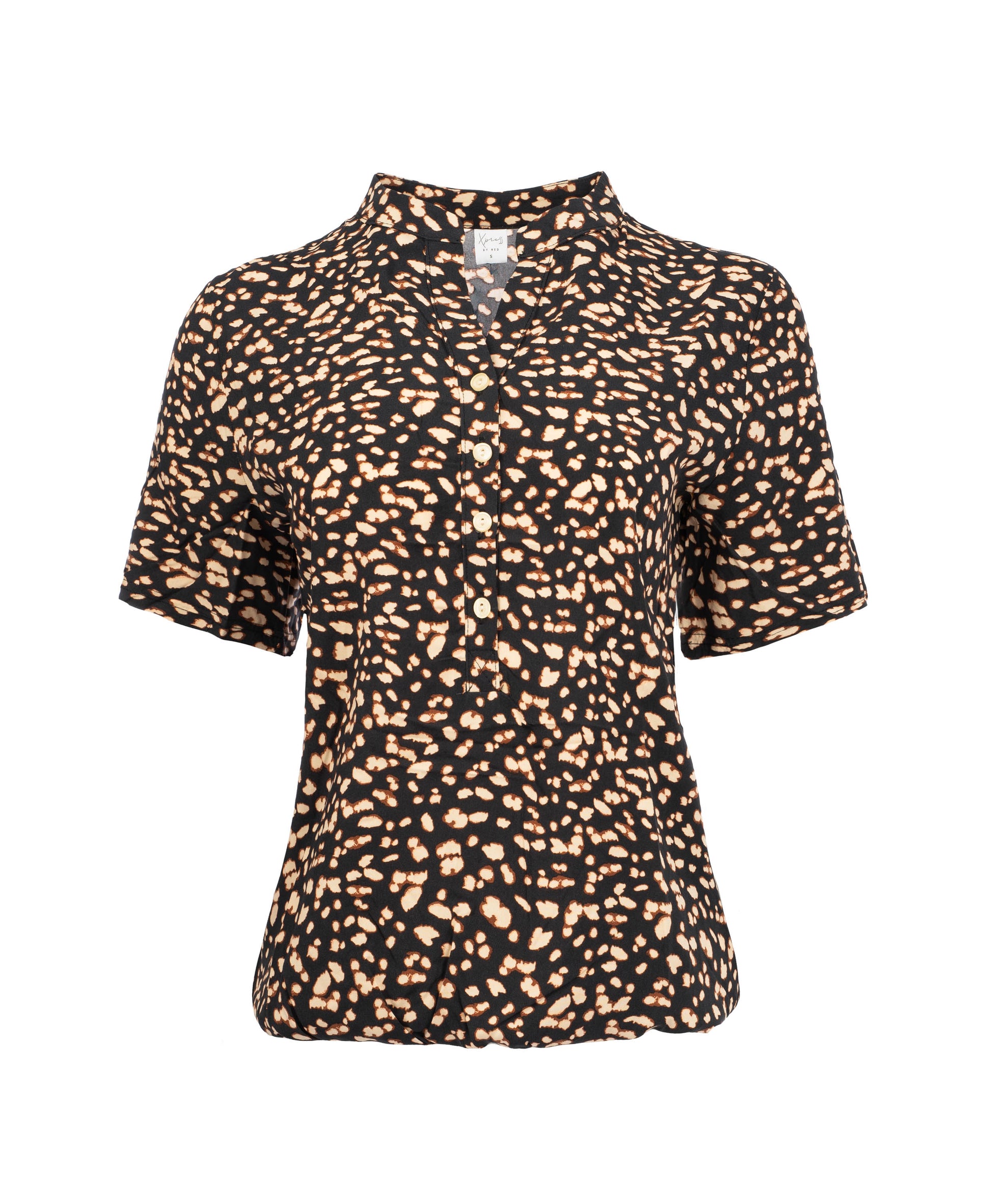 Deze stijlvolle top combineert een speels dessin met een tijdloos model. De zwarte basis wordt verlevendigd door een all-over zwarte druppelprint, wat zorgt voor een modieuze en toch veelzijdige uitstraling. De halve knooplijst geeft de top een casual-chic look en maakt hem gemakkelijk aan en uit te trekken. De korte mouwen en de soepele, licht getailleerde pasvorm zorgen voor optimaal draagcomfort.