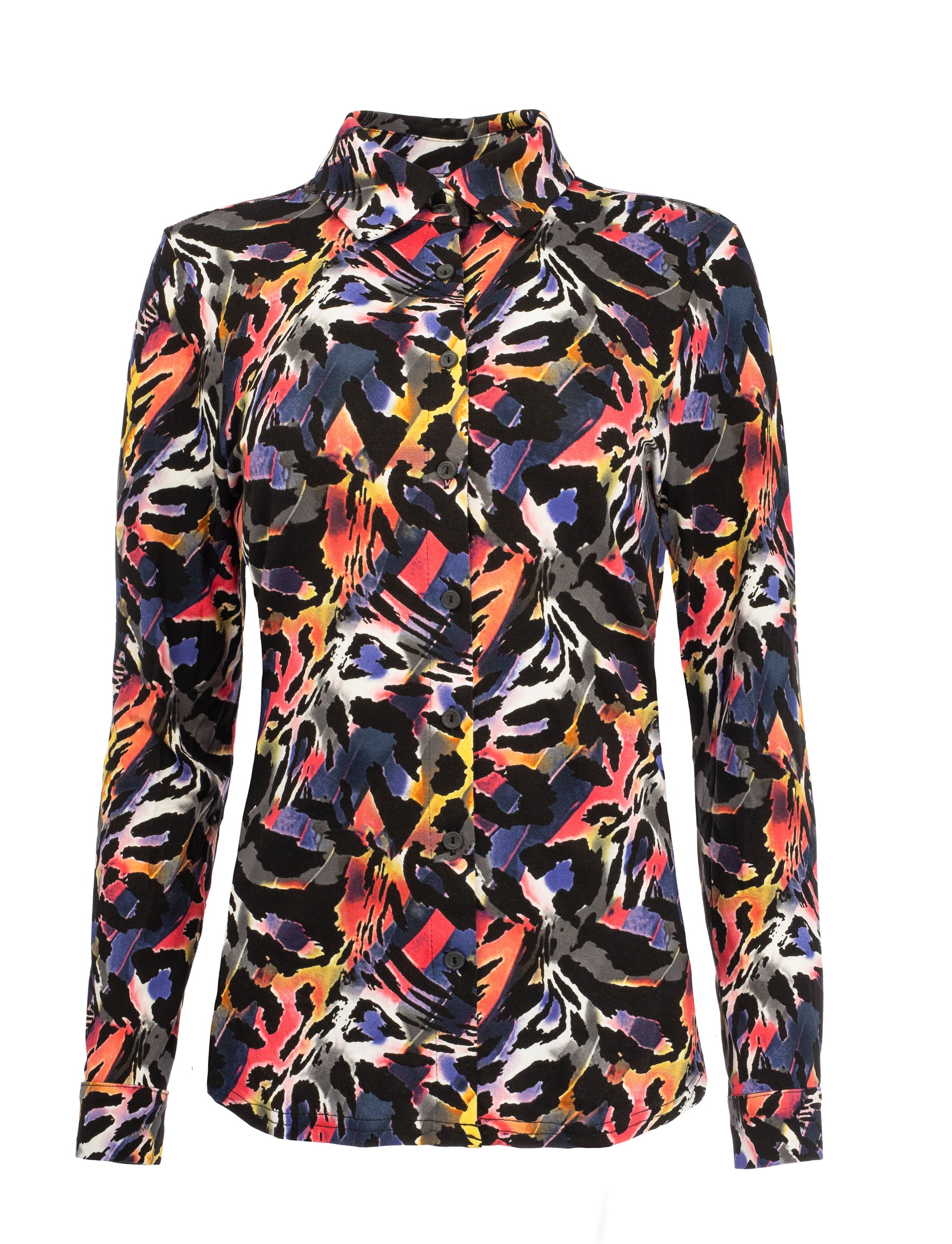 Deze opvallende blouse is een echte eyecatcher dankzij de mix van een kleurrijke print. Het model heeft een klassieke overhemdkraag met een knoopsluiting voor een strakke, elegante look. De soepele, lichtgewicht stof zorgt voor een comfortabele pasvorm en een mooie valling. De lange mouwen maken deze blouse geschikt voor zowel casual als geklede gelegenheden.