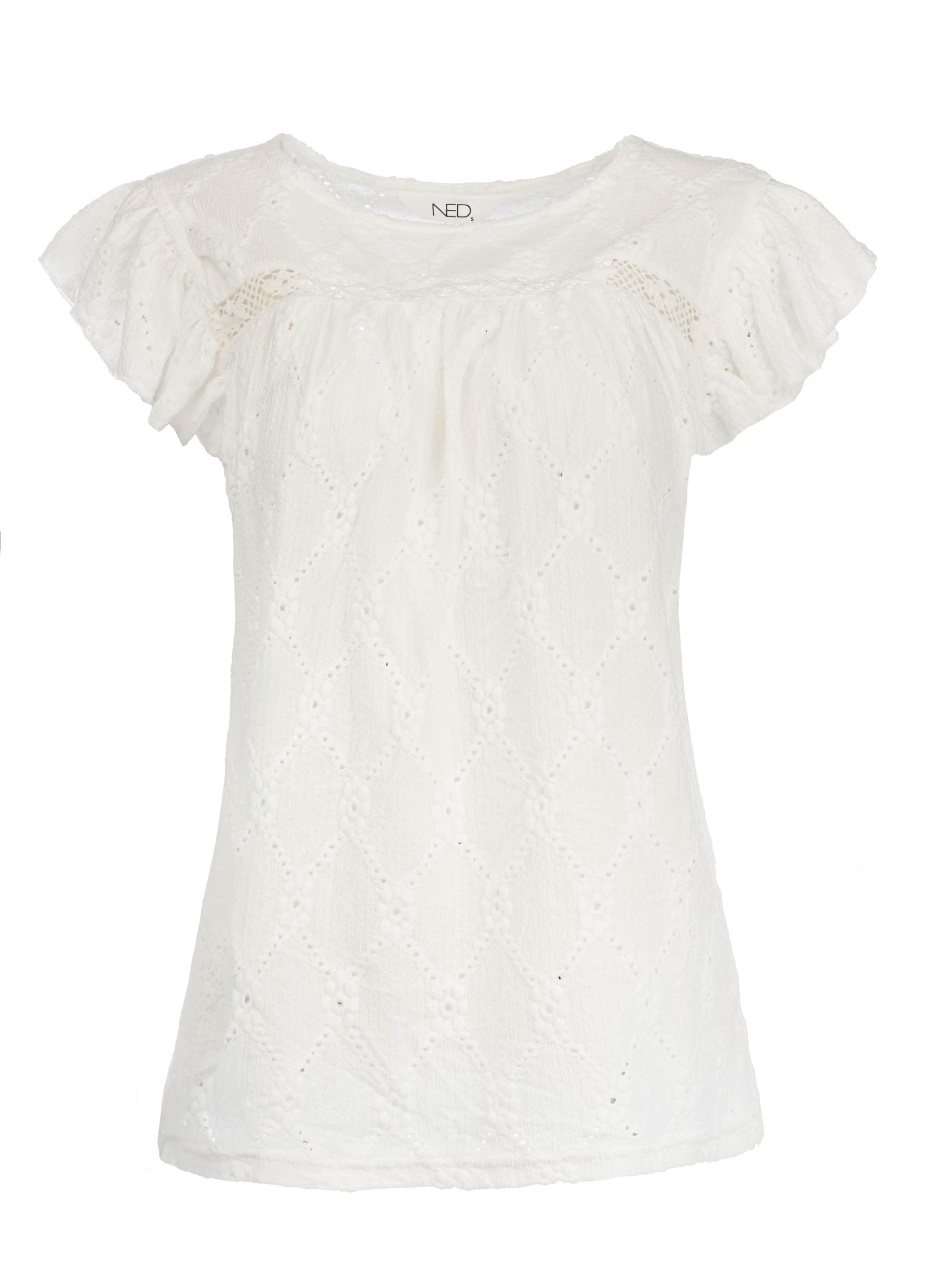 Deze elegante top met verfijnde broderie structuur is een tijdloze zomerse essential met een vrouwelijke en romantische uitstraling. Het subtiele ajour- en reliëfpatroon geeft de stof een luxe, luchtig karakter, terwijl de korte mouwen met zachte ruches zorgen voor een speels en elegant accent. De ronde hals houdt het ontwerp rustig en veelzijdig.