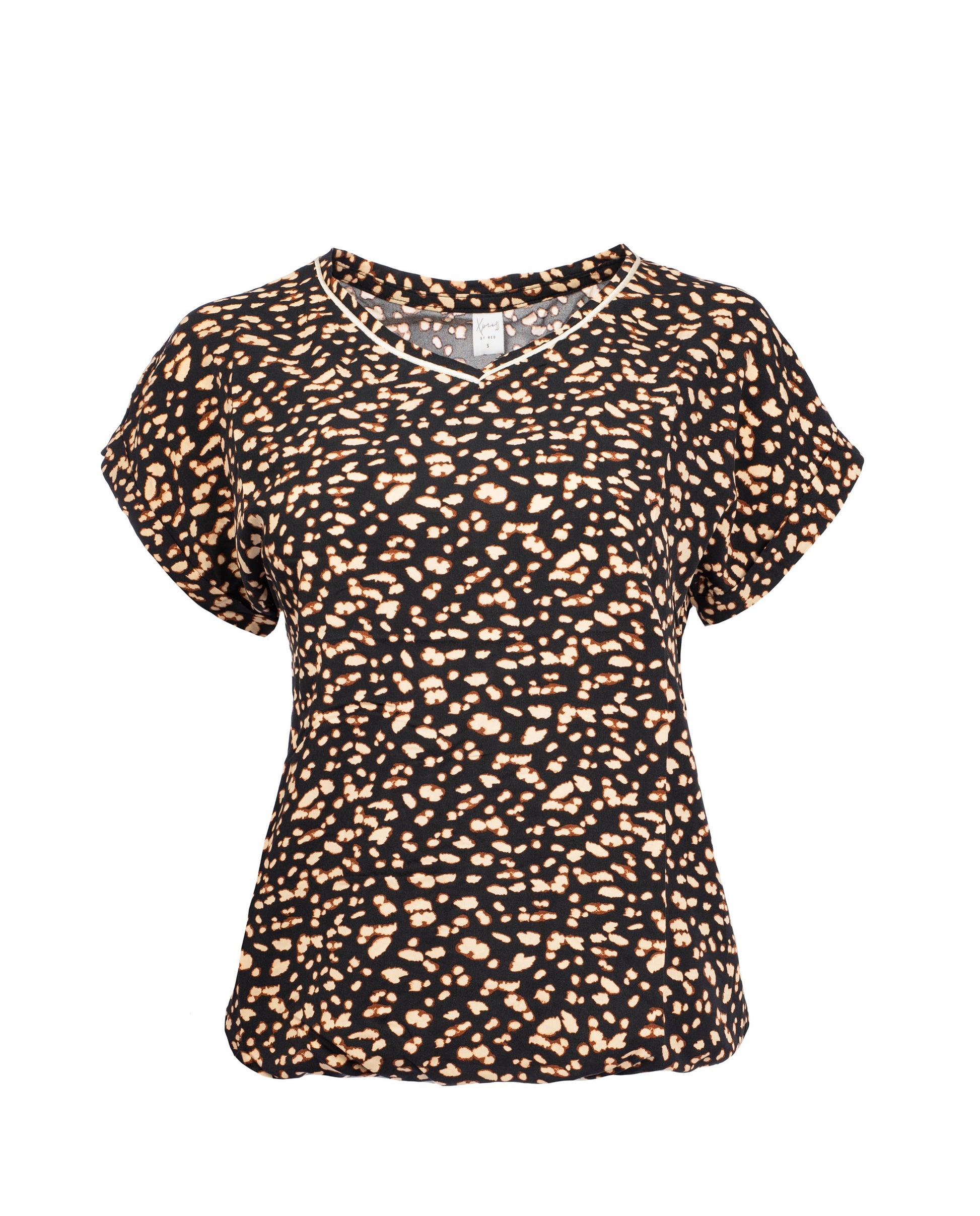 Draag deze top op een zwarte broek of rok voor een elegante look, of combineer met een lichte jeans voor een stoer contrast. Mooie accessoires in goud of geel accentueren het kleurdetail in de print.