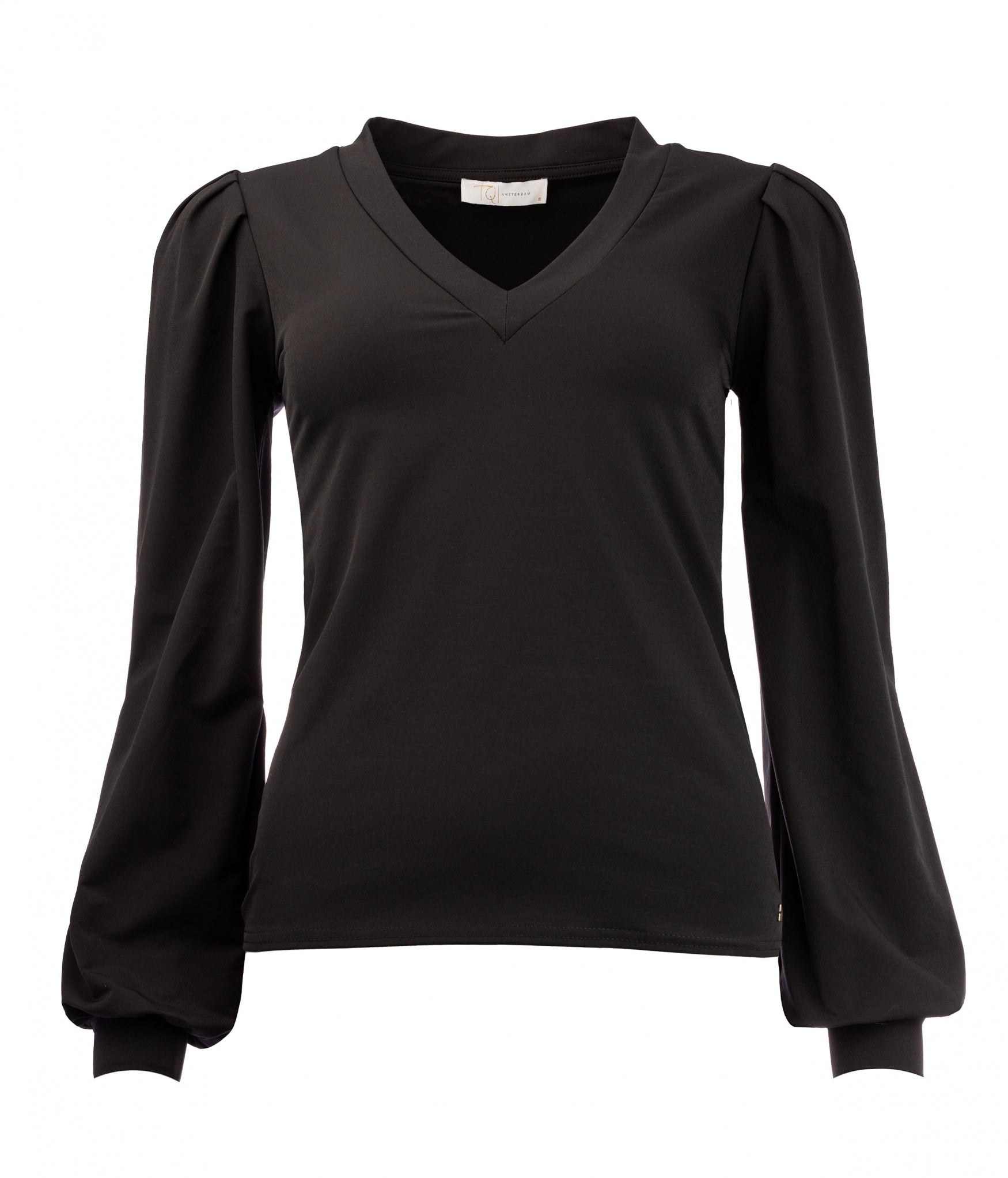 Deze Travelstof top van de TQ Amsterdam heeft een mooie V-hals en lange pofmouwen wat de top een vrouwelijke look geeft.