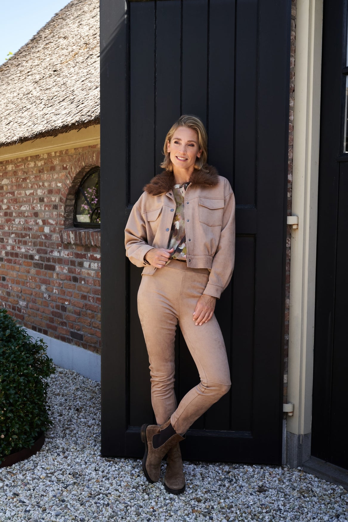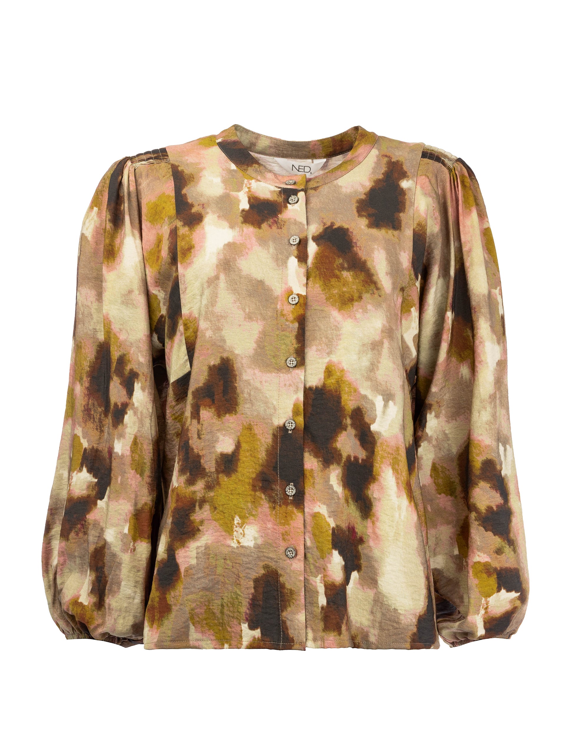 Deze stijlvolle blouse is een echte must-have voor een vrouwelijke en elegante look. De hooggesloten kraag geeft een chique uitstraling, terwijl de ballonmouwen met elastiek zorgen voor een trendy en speels effect. De prachtige print in ecru, bruin en roze tinten maakt dit item uniek en perfect om op te vallen.