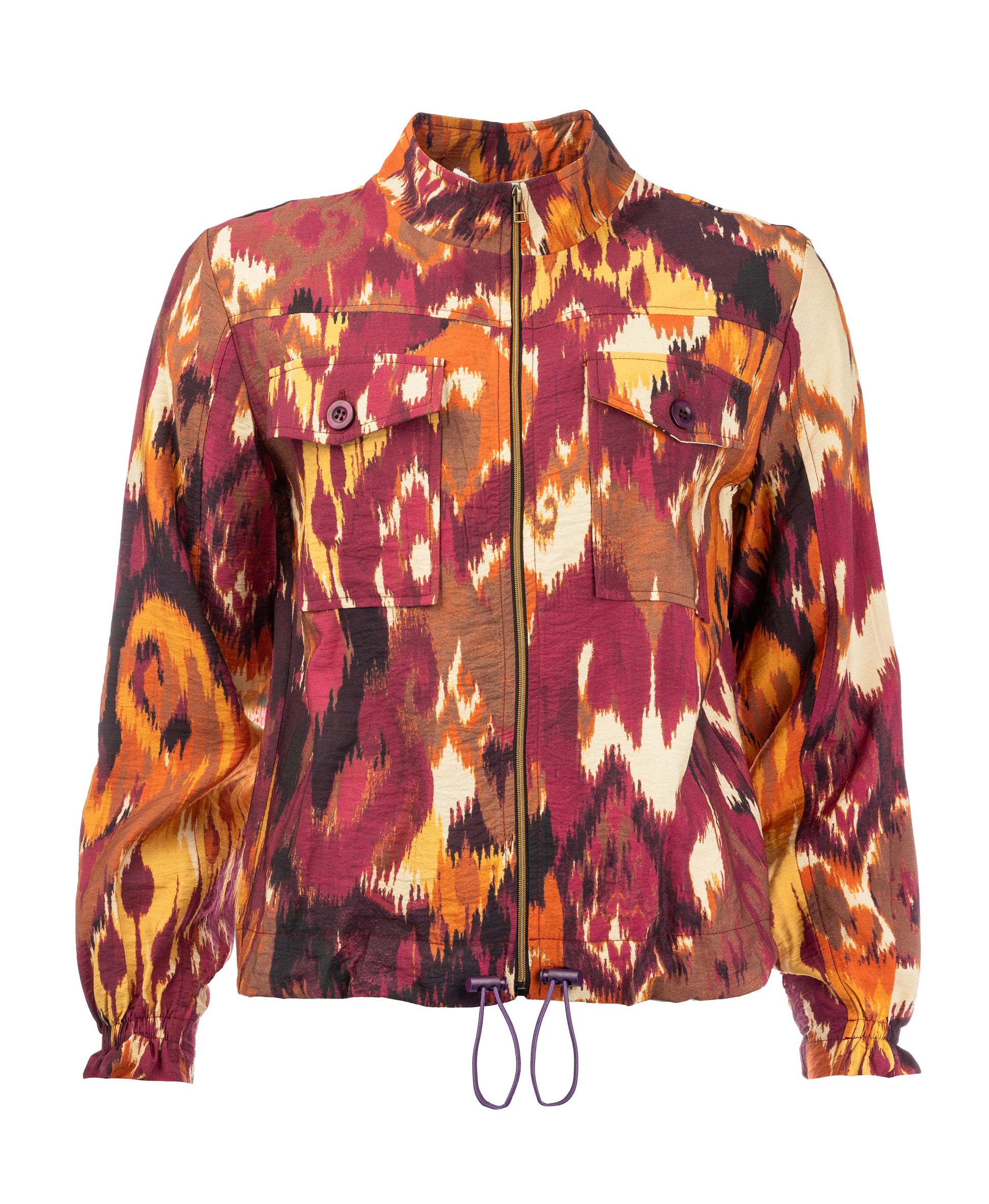 Geef je outfit een modieuze upgrade met dit opvallende jasje, uitgevoerd in een modieuze print met rode en paarse accenten. De stoere en sportieve uitstraling wordt mooi gecombineerd met een vrouwelijke touch door het licht blouse model en het speelse trekkoord aan de onderzijde. Dit jasje is zowel functioneel als stijlvol – perfect voor het voor- en najaar of frisse zomeravonden.