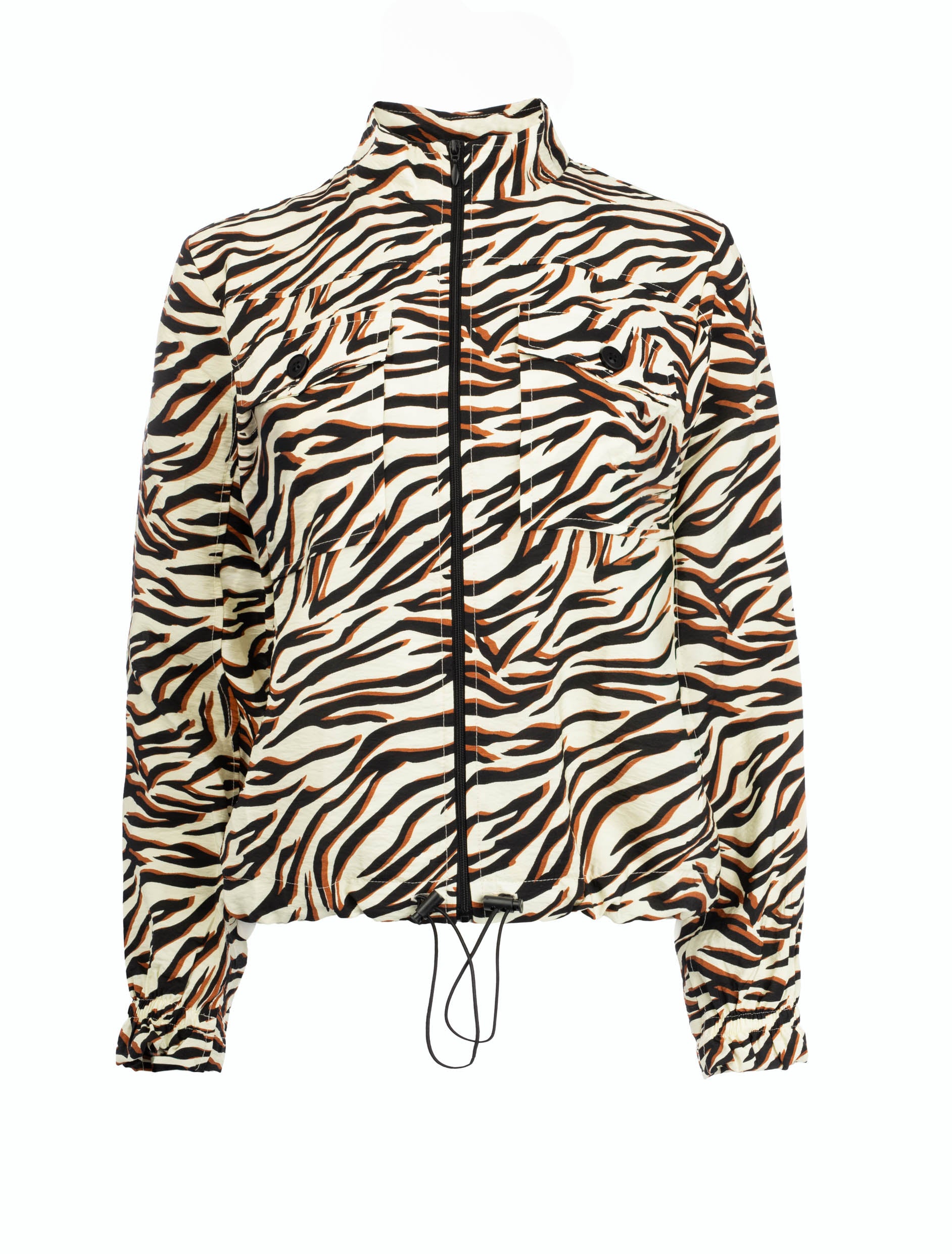 Geef je outfit een modieuze en stoere uitstraling met dit trendy jasje met zebraprint. Het jasje heeft een hoge kraag en ritssluiting middenvoor, wat zorgt voor een moderne look met een sportieve twist. De zachte, soepele stof voelt comfortabel aan en maakt het jasje ideaal voor zowel casual als geklede gelegenheden. Dankzij de aantrekkoord aan de onderzijde kun je de pasvorm eenvoudig aanpassen naar wens.