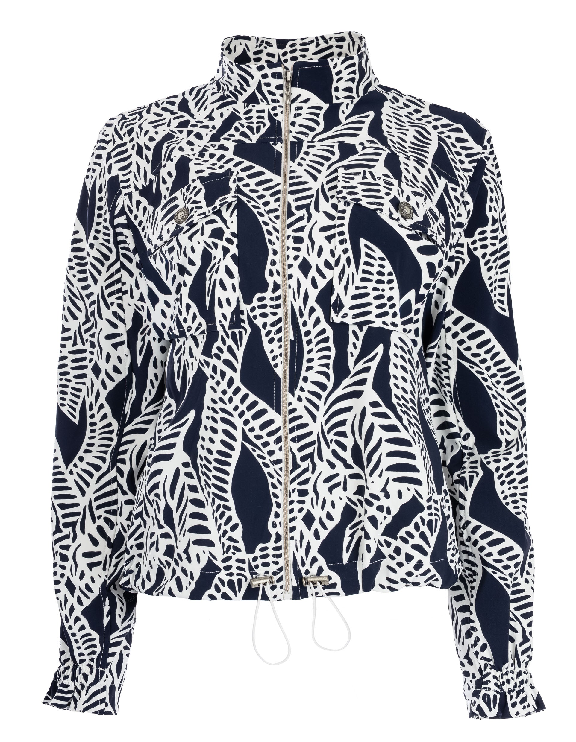 Het jasje is uitgevoerd met een opstaande kraag, ritssluiting aan de voorzijde en een verstelbaar koord aan de onderzijde. Hierdoor krijgt het ontwerp een eigentijdse uitstraling en kun je het silhouet speels aanpassen. De lange mouwen en de soepelvallende stof zorgen voor comfortabel draaggemak, terwijl de all-over print het jasje tot een echte eyecatcher maakt.