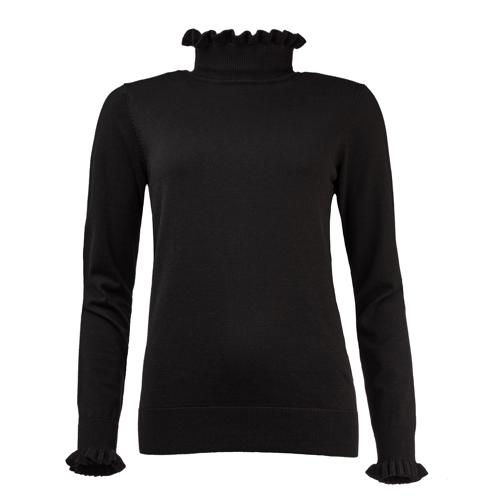 Deze elegante koltrui is een tijdloze basic met een vrouwelijke twist. De fijngebreide kwaliteit zorgt voor een comfortabele pasvorm, terwijl de ruffle details langs de kol en mouwuiteinden de trui een speelse en stijlvolle uitstraling geven.