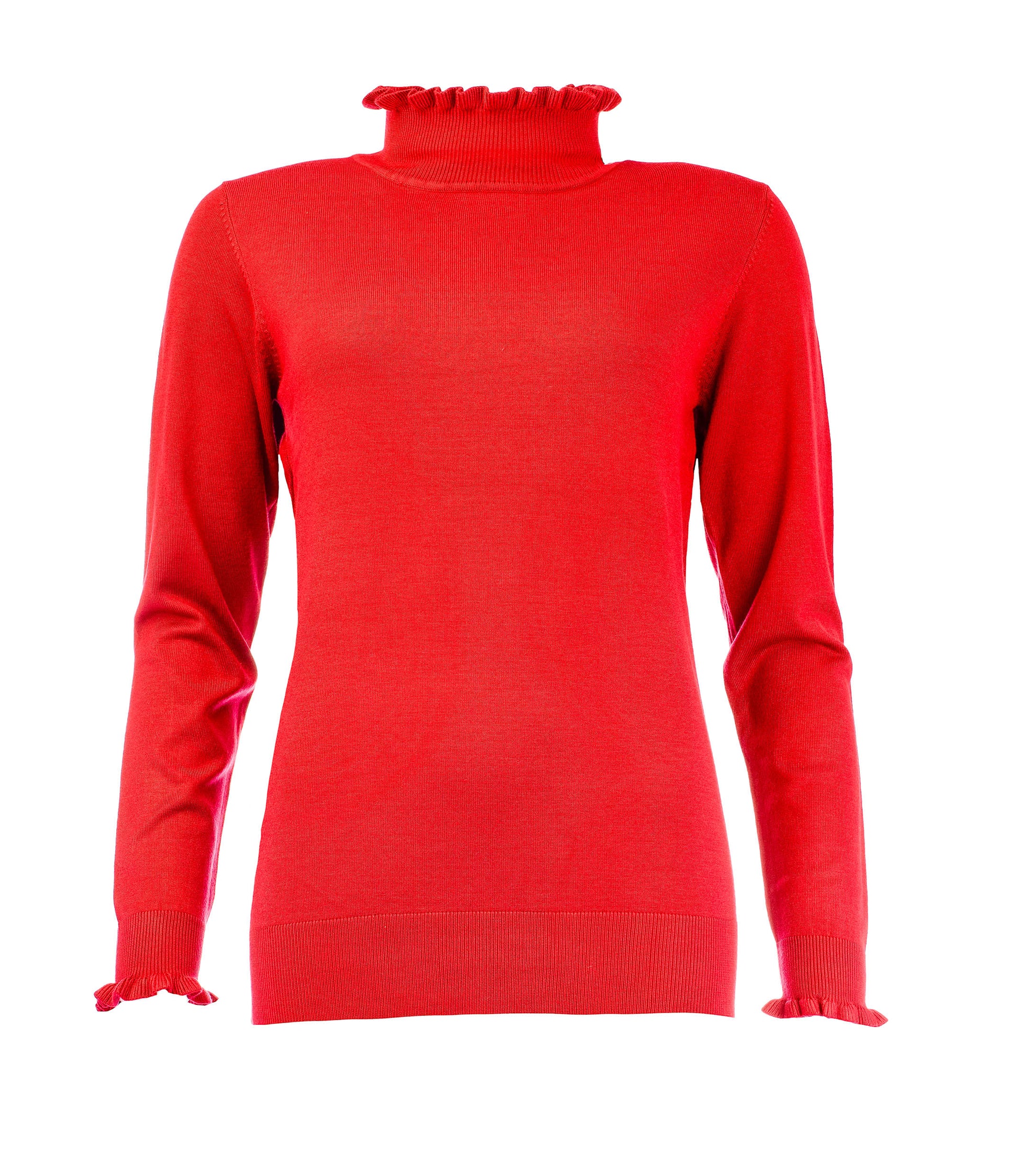 Deze elegante koltrui is een tijdloze basic met een vrouwelijke twist. De fijngebreide kwaliteit zorgt voor een comfortabele pasvorm, terwijl de ruffle details langs de kol en mouwuiteinden de trui een speelse en stijlvolle uitstraling geven.