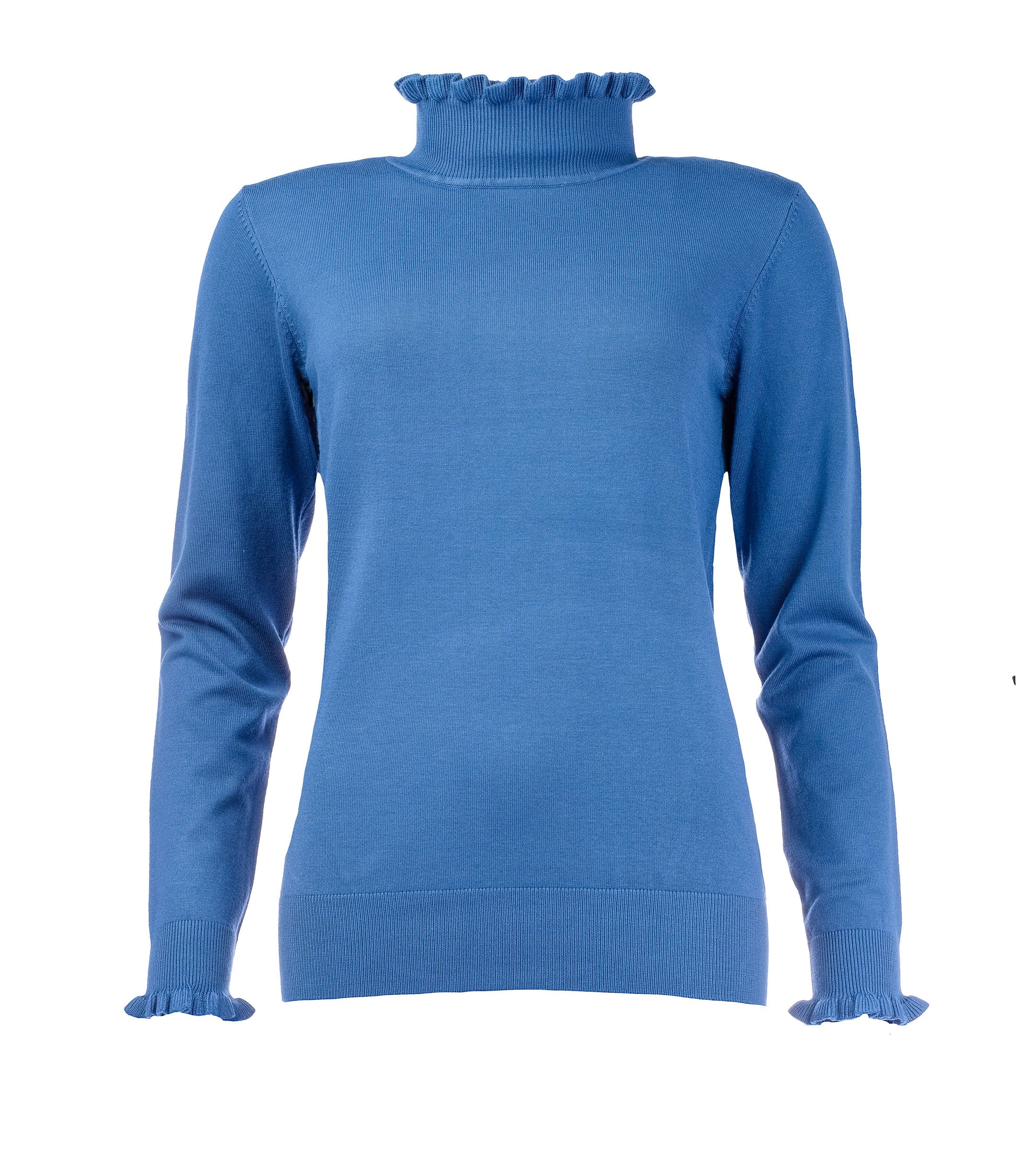 Deze elegante koltrui is een tijdloze basic met een vrouwelijke twist. De fijngebreide kwaliteit zorgt voor een comfortabele pasvorm, terwijl de ruffle details langs de kol en mouwuiteinden de trui een speelse en stijlvolle uitstraling geven.