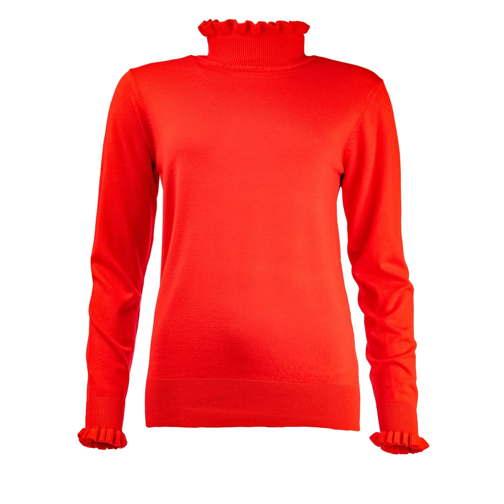 Deze elegante koltrui is een tijdloze basic met een vrouwelijke twist. De fijngebreide kwaliteit zorgt voor een comfortabele pasvorm, terwijl de ruffle details langs de kol en mouwuiteinden de trui een speelse en stijlvolle uitstraling geven.