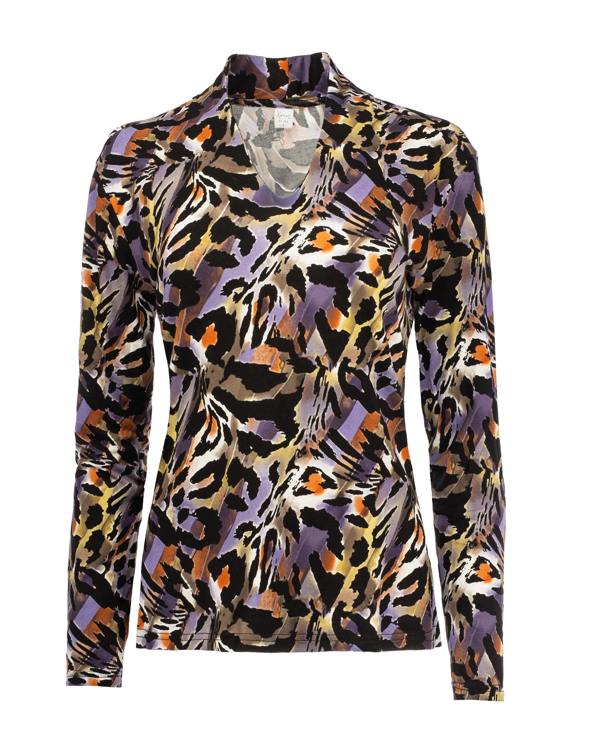 Deze stijlvolle lange mouwtop is een echte blikvanger dankzij de artistieke all-over print in diepe herfstkleuren. De vrouwelijke V-hals en licht getailleerde snit zorgen voor een flatterend silhouet, terwijl de soepele stof comfortabel met je meebeweegt.